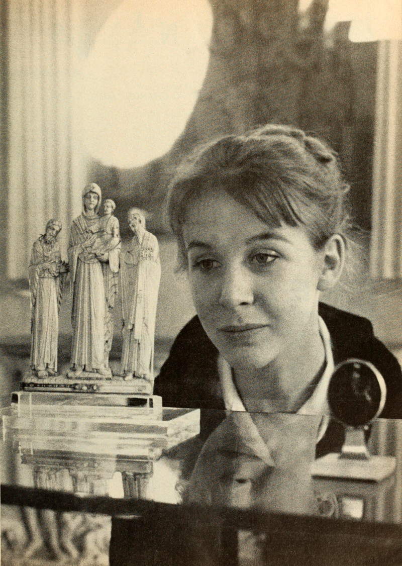 At first glance we thought this was a backsided view of religion, but presumably she's merely reflected in a mirror. Still, their eyes aren't down there, lady. From Together, 1959.