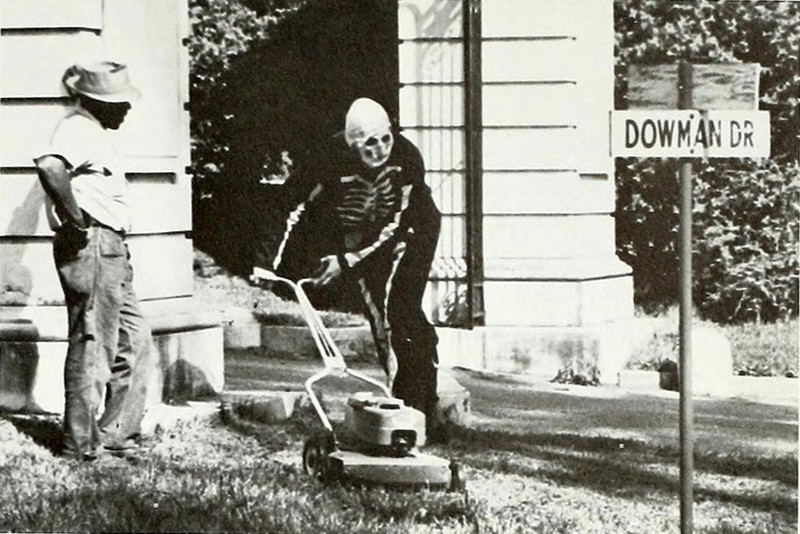 Today's skeleton mowing the lawn is from Emory University's 1987 yearbook.