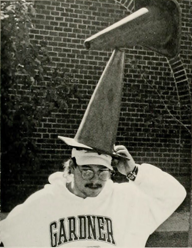 #vintage photo #vintage yearbook #yearbook #mustache #hat #vintage man #moustache #conehead #man #traffic cone #photo