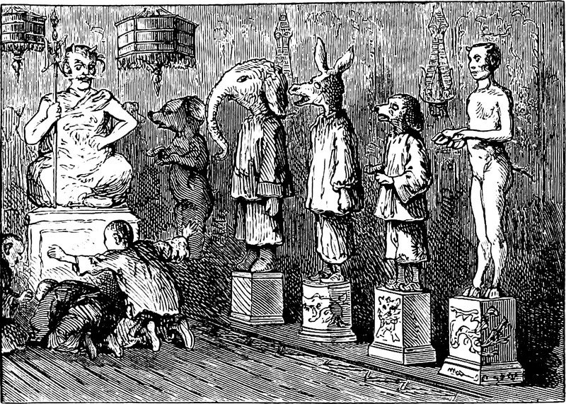 Here's a precursor to the "great dorg" of a film Mannequin (1987), from The Tinted Venus by J. Bernard Partridge, 1898. The caption reads, "'It is a miserable thing,' he was thinking, 'for a man to have a female statue trotting after him like a great dorg.'"