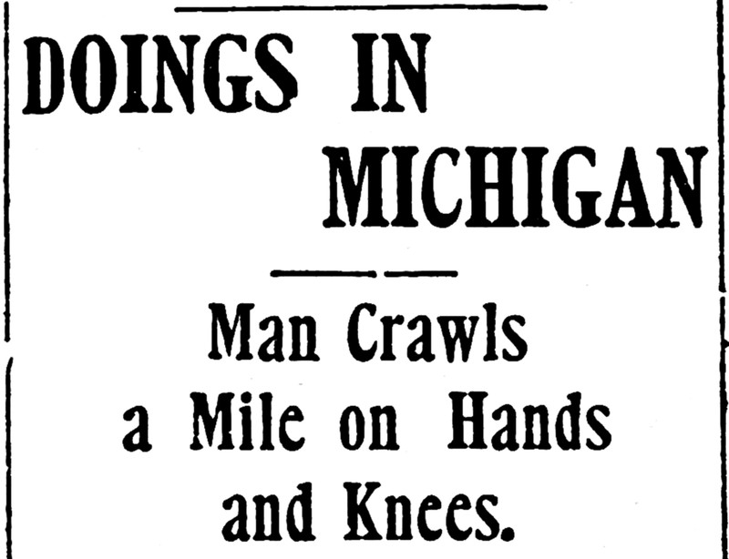 "Doings in Michigan.  Man crawls a mile on his hands and knees."  From the Duluth Evening Herald, 1904.