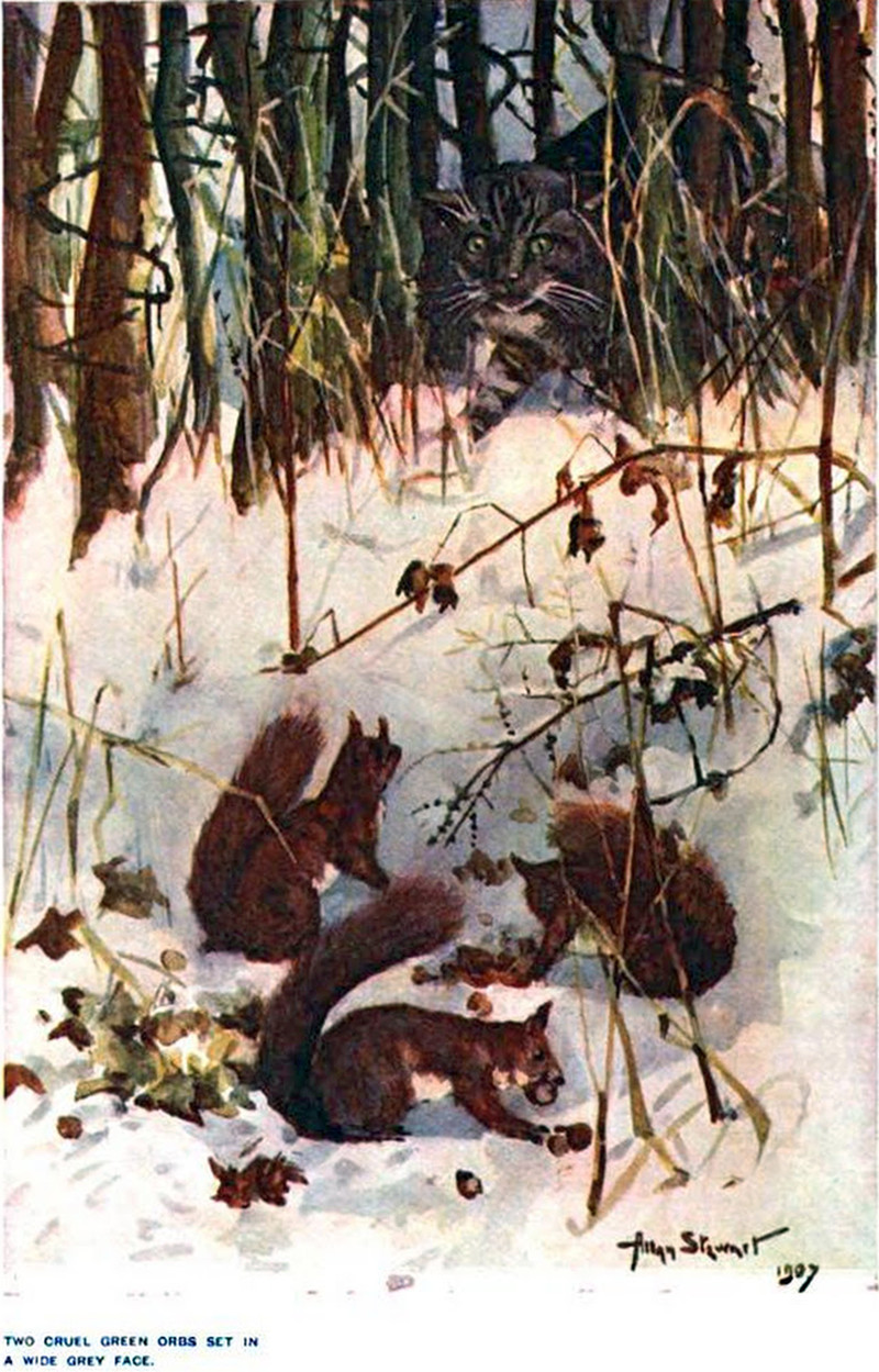Lynx versus squirrel: which would you wager to win? From Tiny Red Squirrel by James Douglas Williams, 1919.