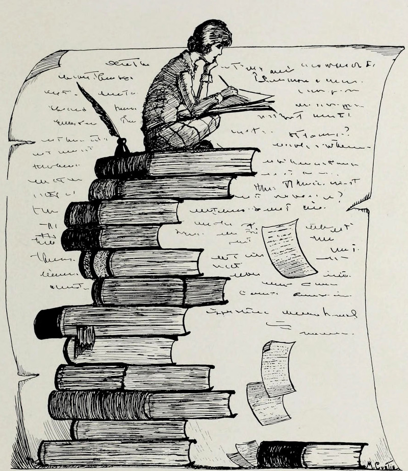 #vintage illustration #books #vintage yearbook #yearbook #writing #1920s #tiny woman #illustration