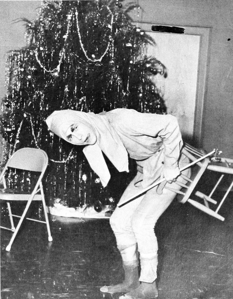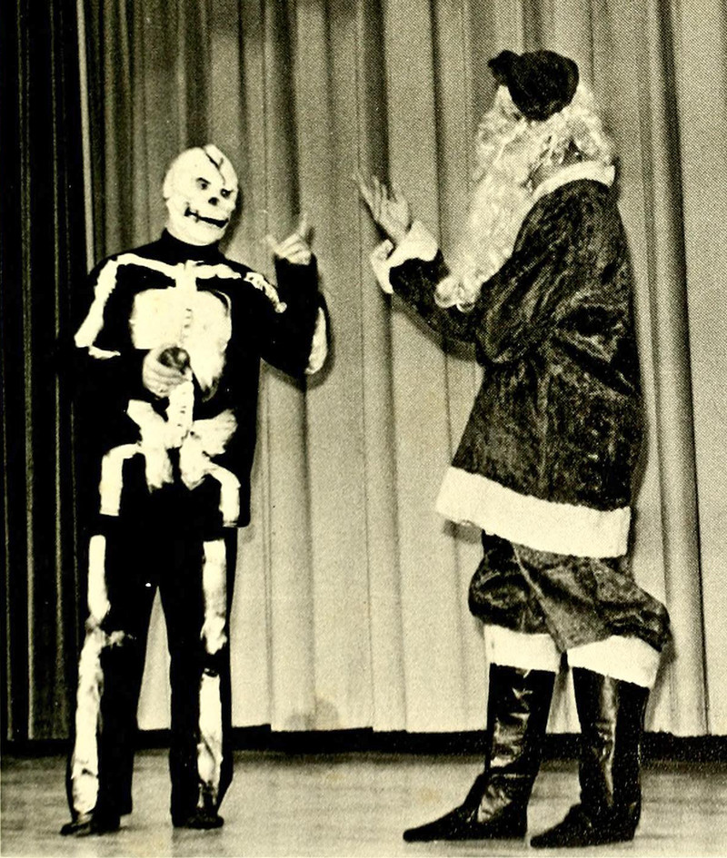 Note the glowing-eyed entities looming in the very back. So often what begins as innocent fun takes a demonic turn. This cursed image is from MacMurray's 1961 yearbook.