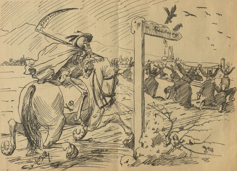 When the boat has eyes, bat wings, and shouded figures aboard, double check your ticket and make sure you're on the right pier. From Lustige Blätter, 1906.