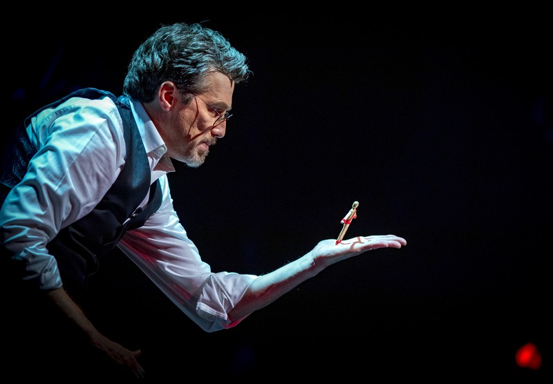 One of Hass' most moving demonstrations of his own thinking actually occurs between the acts, during the intermission. As the audience gradually returns to their seats, they find Hass already on stage, subtly lit, sitting in a comfy chair, perusing a beloved book of classic magic posters. Wordlessly, casually, he reveals himself doing what he really does do in his daily life: studying, celebrating, meditating upon his mentors and his inspirations, luxuriating in the history, the glamor, and the human stories that have carried him to this day. After the standing ovation, I overheard an audience member exclaiming that it was the intermission, ironically, that offered him the most profound moments of the entire show.