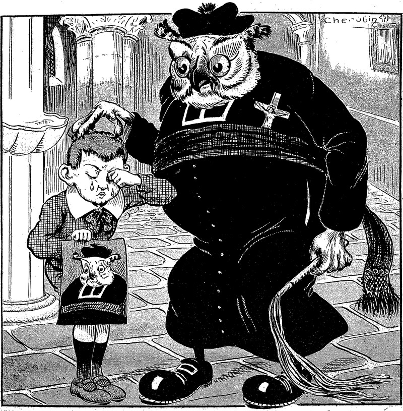 Not referring to this image in particular, but this anti-Roman Catholic magazine of the early 1900s was so over-the-top virulent as to seem genuinely evil in itself, ironically giving credence to the tenets of Catholicism that were meant to be lampooned. Also, it's fascinating to see that priests were depicted as womanizers and alcoholics, not as any of the things they're accused of today, which shows up how political power struggles are crafted according to the mores of their time. In a few decades from today, priests will be subjected to yet a different set of accusations, whatever seems most controversial then. And of course these sorts of heated sarcasms are never actually about anything philsophical, but rather greed for money and control to change hands. There's an age-old game, alright, but religion isn't even in the ballpark.