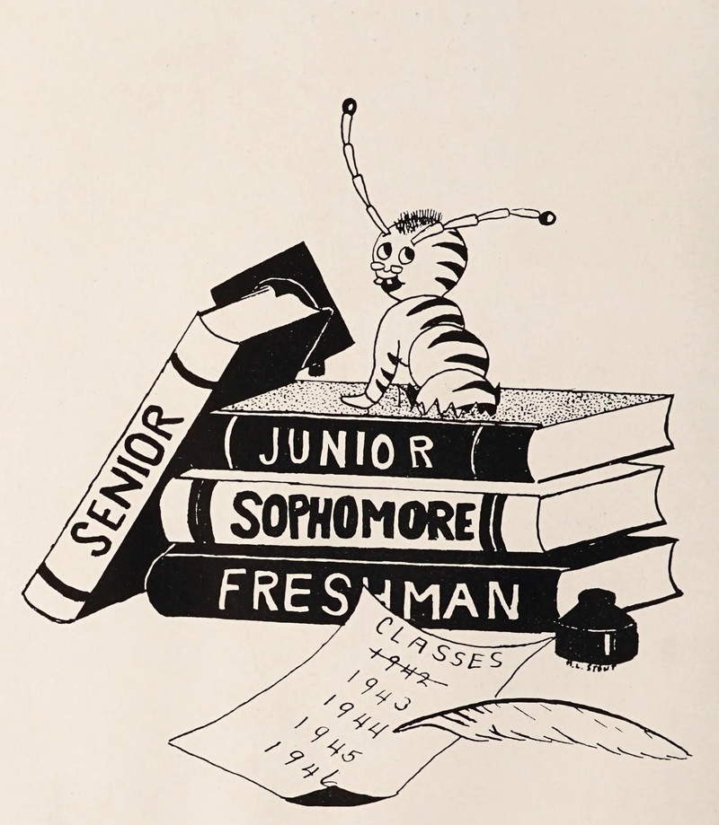 #vintage illustration #vintage yearbook #yearbook #bookworm #1940s #illustration