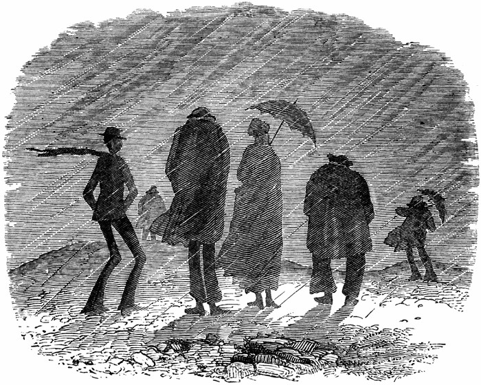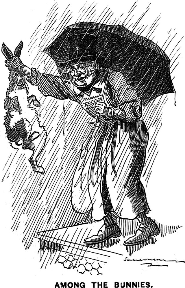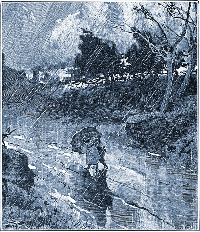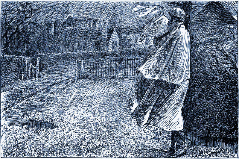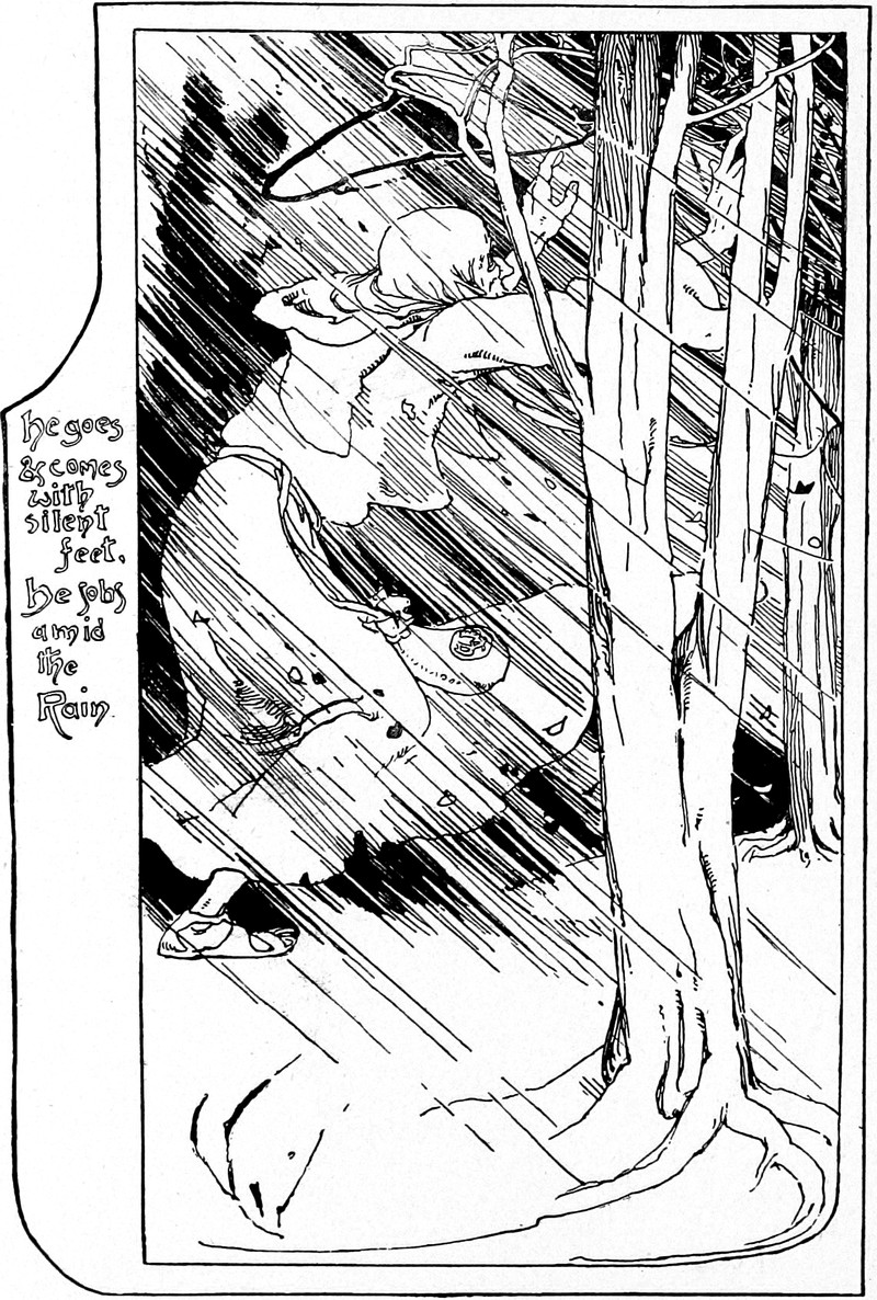"He goes and comes with silent feet. He sobs amid the rain." From Red Apple and Silver Bells by Hamish Hendry and illustrated by Alice B. Woodward, 1899.