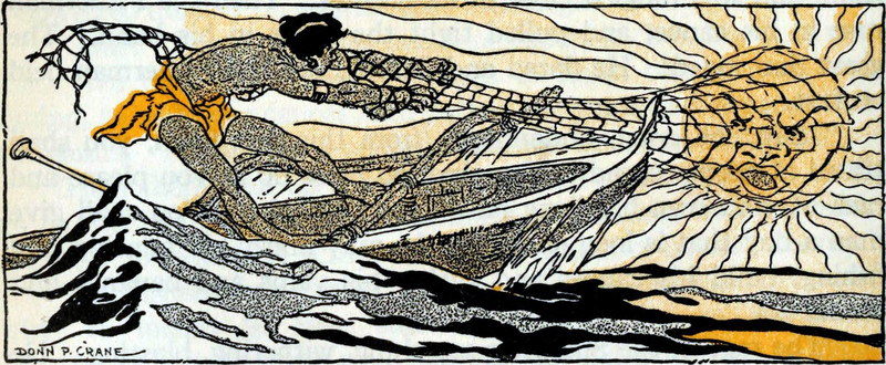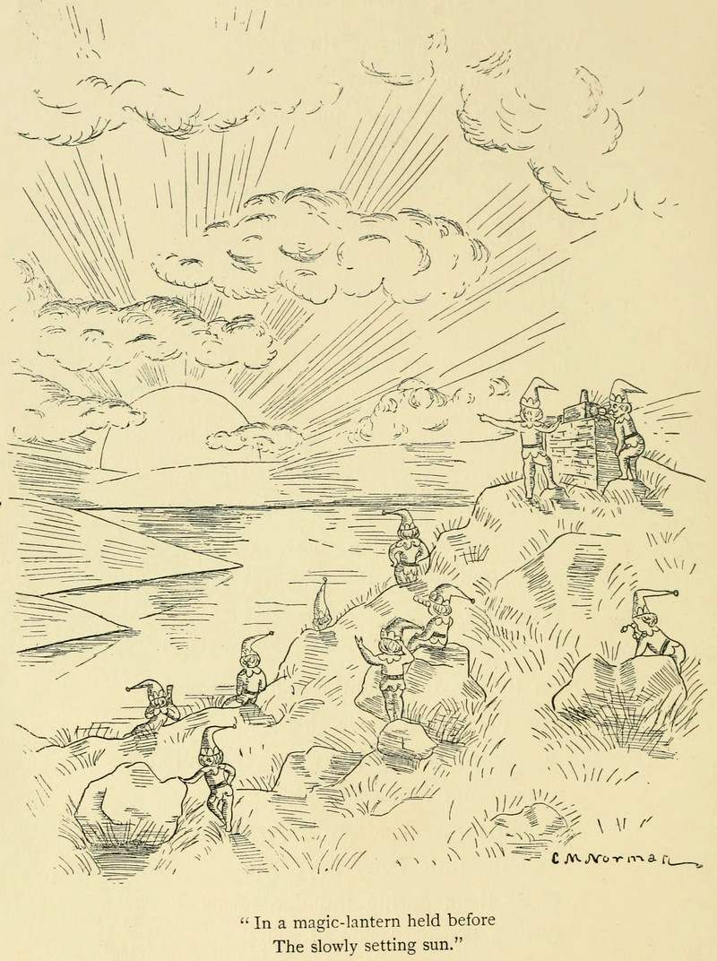 "In a magic lantern held before the slowly setting sun." From The Wonderful Fairies of the Sun by Ernest Vincent Wright and illustrated by Cora M. Norman, 1896.