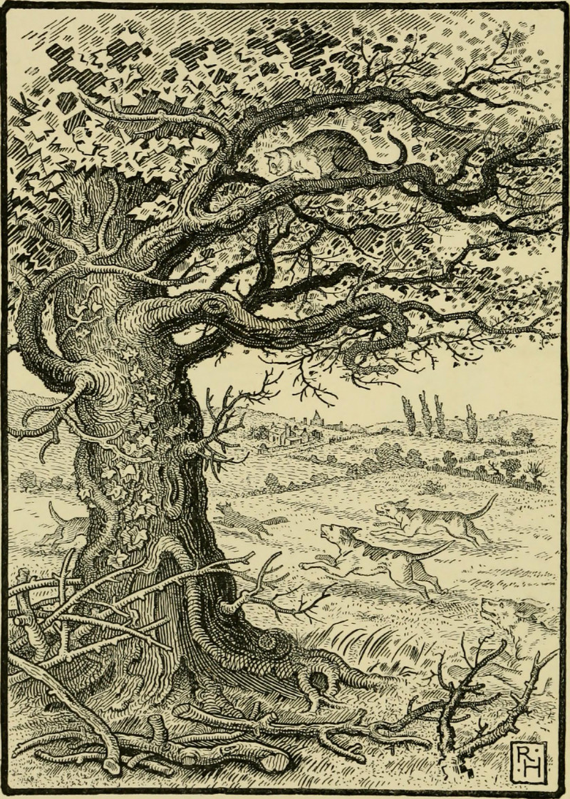 #vintage illustration #fable #cat #tree #aesop #hounds #cat in a tree #illustration #up a tree #art
