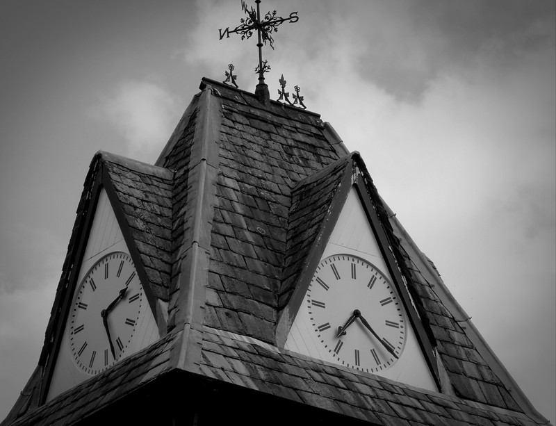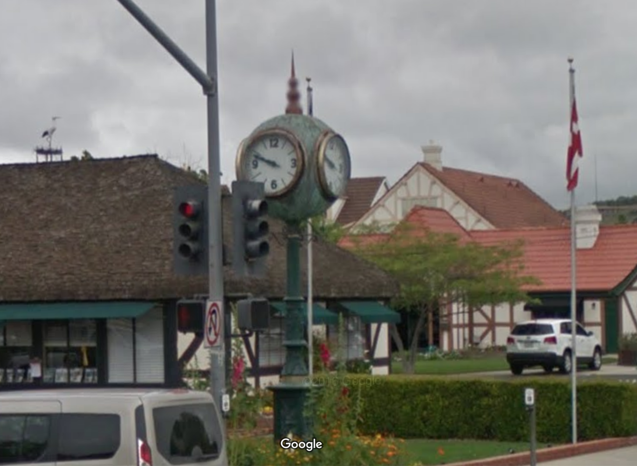 We spotted a temporal anomaly while virtually re-visiting the charming Danish village of Solvang, California via Google Street View. Facing south, the clocks on the downtown street corner proclaim that it's 2:20. Facing north, it's 9:49. From the east and west, it's 12 36. Amazingly, when you virtually cross the intersection via Google Street View, it takes about 4 and a half hours according to the clock. Note the clock faces as you wait at the red light, then click forward and marvel at how long that light lasted! (Note: don't click too far down the road, or you'll zoom too far forward. Click just in the intersection itself so as to inch forward. You may or may not have to rotate slightly to see the clock on your left.)