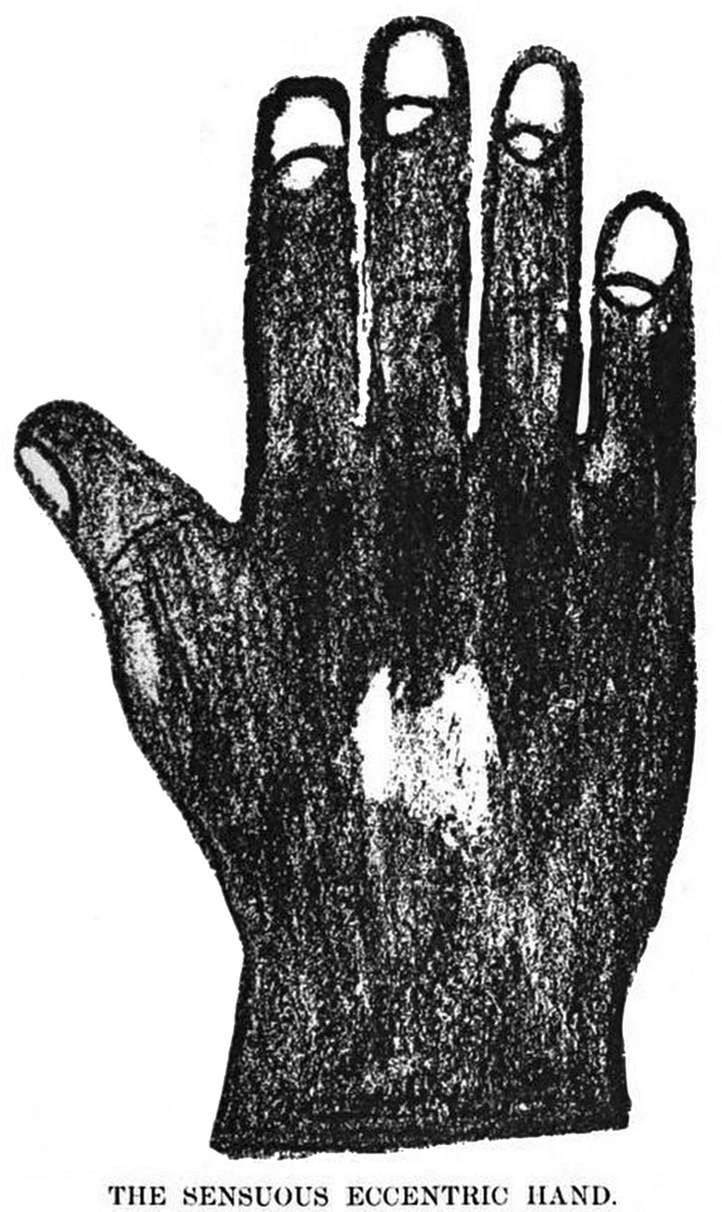 "The sensuous eccenrtic hand." The caption doesn't say this is the hand of a sensuous eccentric person but rather that the hand itself embodies sensuous eccentricity. Therefore, the illustration is transformed into a talisman, akin to the Hand of Fatima. From New Discoveries in Palmistry by Joseph Bryant Hargett, 1901.