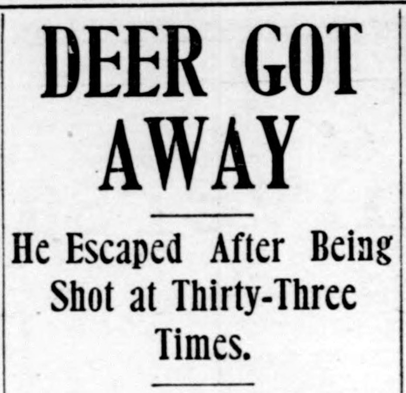 "Deer got away.  He escaped after being shot at thirty-three times."  From the Duluth Herald, 1904.