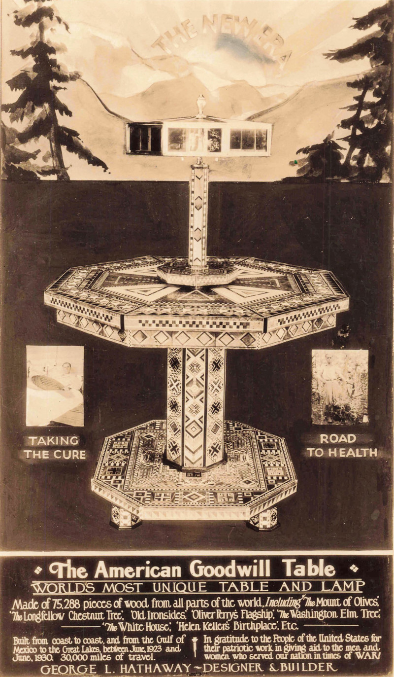 George Hathaway's American Goodwill Table from the Chicago World's Fair. "Made of 75,288 pieces of wood from all parts of the world, including the Mount of Olives, the Longfellow chestnut tree, Old Ironsides, Oliver Perry's flagship, the Washington elm tree, the White House, Helen Keller's birthplace, etc." From 1933, via UpNorthMemories.