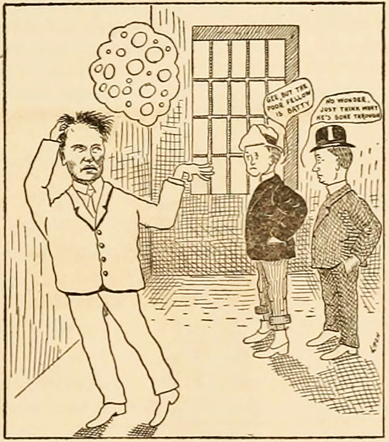 "Gee, but the poor fellow is batty."  "No wonder.  Just think what he's gone through."  From Ohio University's 1909 yearbook.