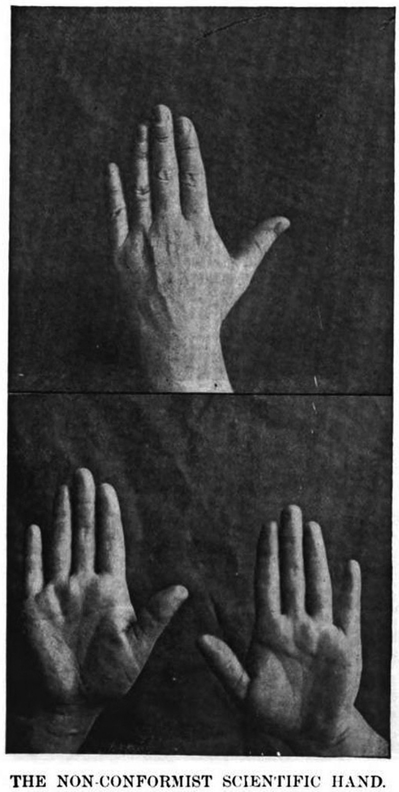 "The non-conformist scientific hand." The caption doesn't identify this as the hand of a non-conforming, scientific person but rather suggests that the hand itself is a non-conforming scientist. From New Discoveries in Palmistry by Joseph Bryant Hargett, 1901.
