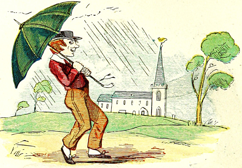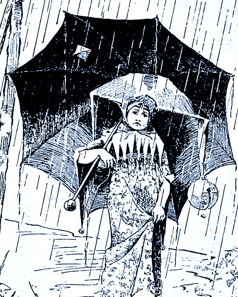 Here's a precursor to Singin' in the Rain. The caption reads, "The desolate, black day touched him no more than a summer shadow touches a sunlit sea, for his whole soul was afire with the golden blaze of his song." From Munsey's Magazine (1920).