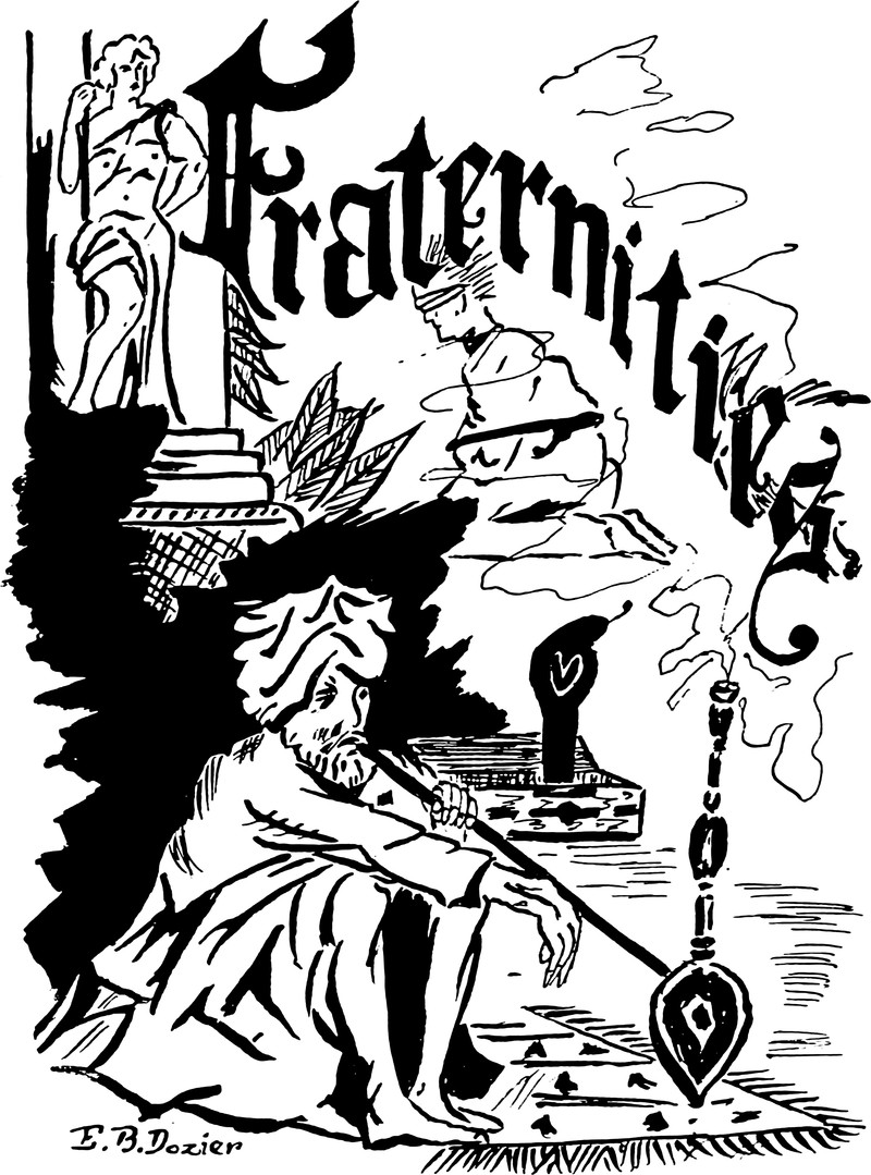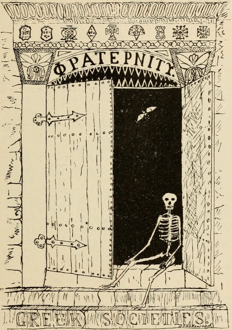 Today's giant-headed skeleton with crossed walking sticks riding a goat, an iPad flying out his bag, is from the 1893 yearbook of the University of Kansas. See How to Hoodoo Hack a Yearbook.
