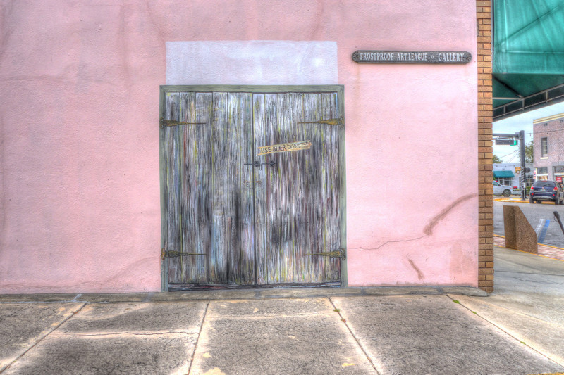 We encountered and determined the cause of a temporal anomaly in Frostproof, Florida. The Citizens Bank clock displays four faces with three different times. As constant investigators of such phenomena, we diagnosed the source of the problem at a glance. Painted on one side of the building is a trompe l'oeil door, recalling Egyptian tombs' false doors to the afterlife (doors "as permeable as fog," in chambers "where nothing purports to be real, where everything stands for something else. ... Even in this timeless scene, change is visible"*). Indeed, the false door has manifested timelessness through the visible adjustments of the clock faces. Though the cause is simple enough, great mysteries yet abound, for whose souls have passed through the false door or received offerings through it?