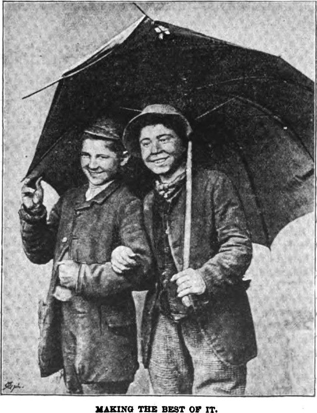 An illustration from an 1899 issue of Good Housekeeping magazine. The caption reads: "Tears mingled with the raindrops on her cheeks as his 'Happy New Year, lady,' followed her down the gloomy street."