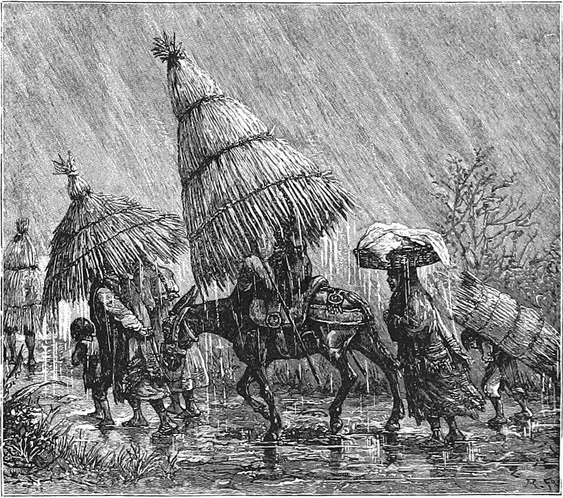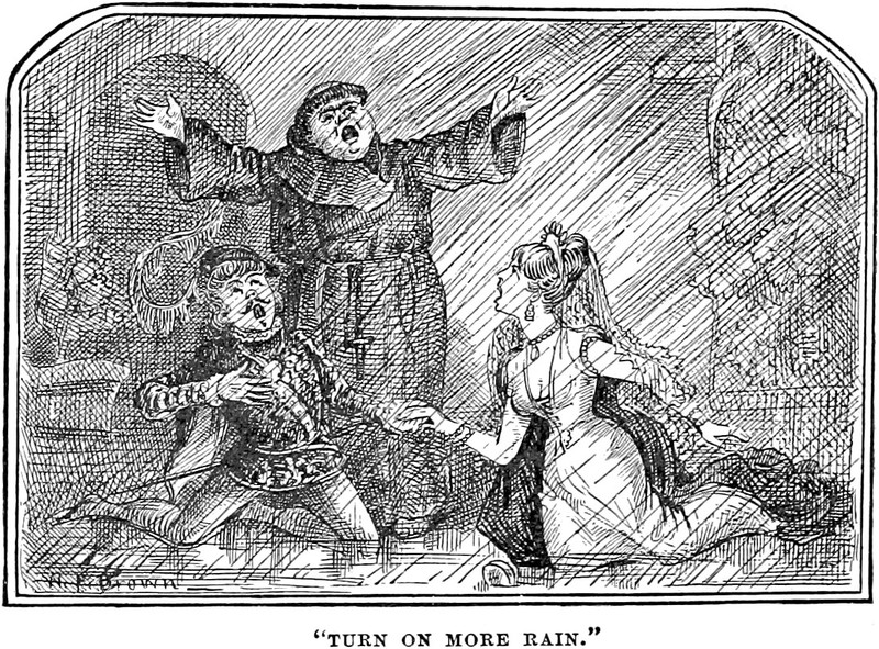 An illustration from an 1887 issue of Frank Leslie's Pleasant Hours magazine. The caption reads: "The rain came on so suddenly, and there I was on the tower, amid the wet ivy, with that stupid boy, who couldn't be made to understand a thing."