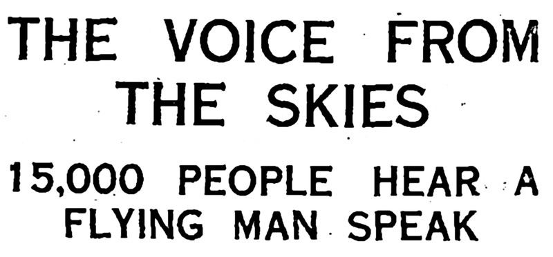 "The voice from the skies. 15,000 people hear a flying man speak." From The Children's Newspaper, 1919.