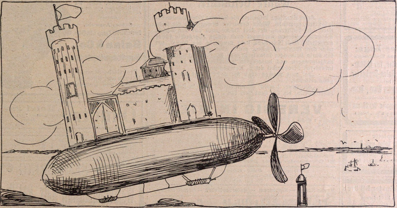 You've heard of (and perhaps even seen) castles in the air, but did you know they're supported by dirigible airships?  From Die Muskete, 1909.