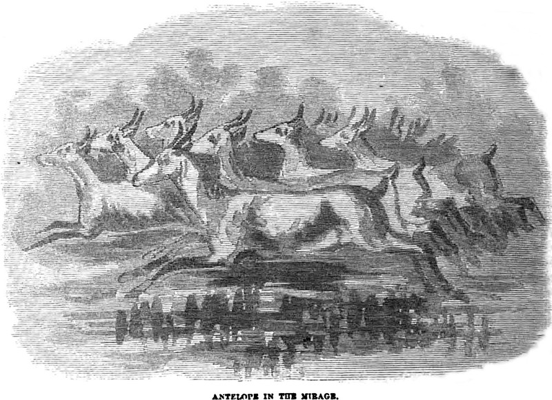 An illustration from an 1861 issue of Harper's magazine.  The caption reads: "Antelope in the mirage."