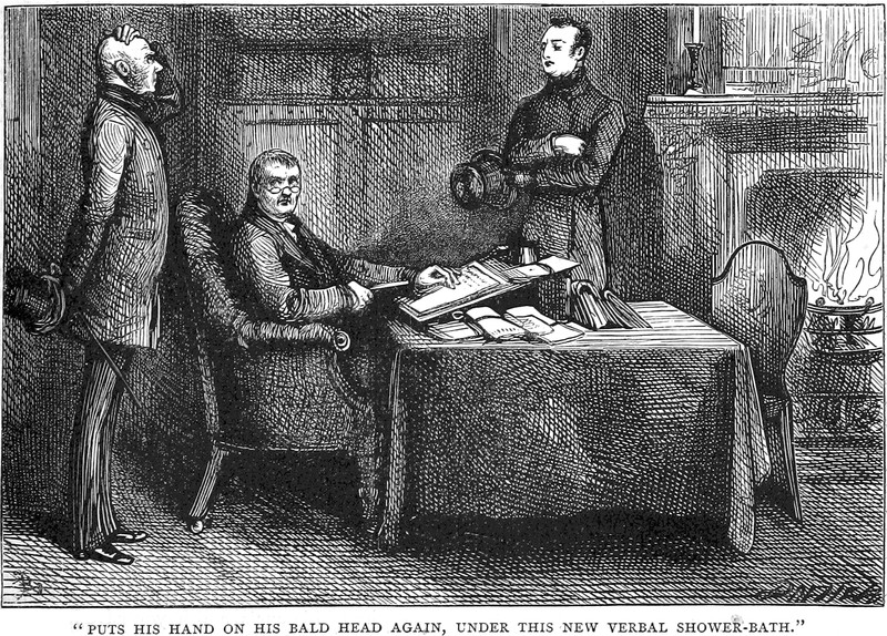 "Puts his hand on his bald head again, under this new verbal shower-bath."  From The Works of Charles Dickens, Household Edition.