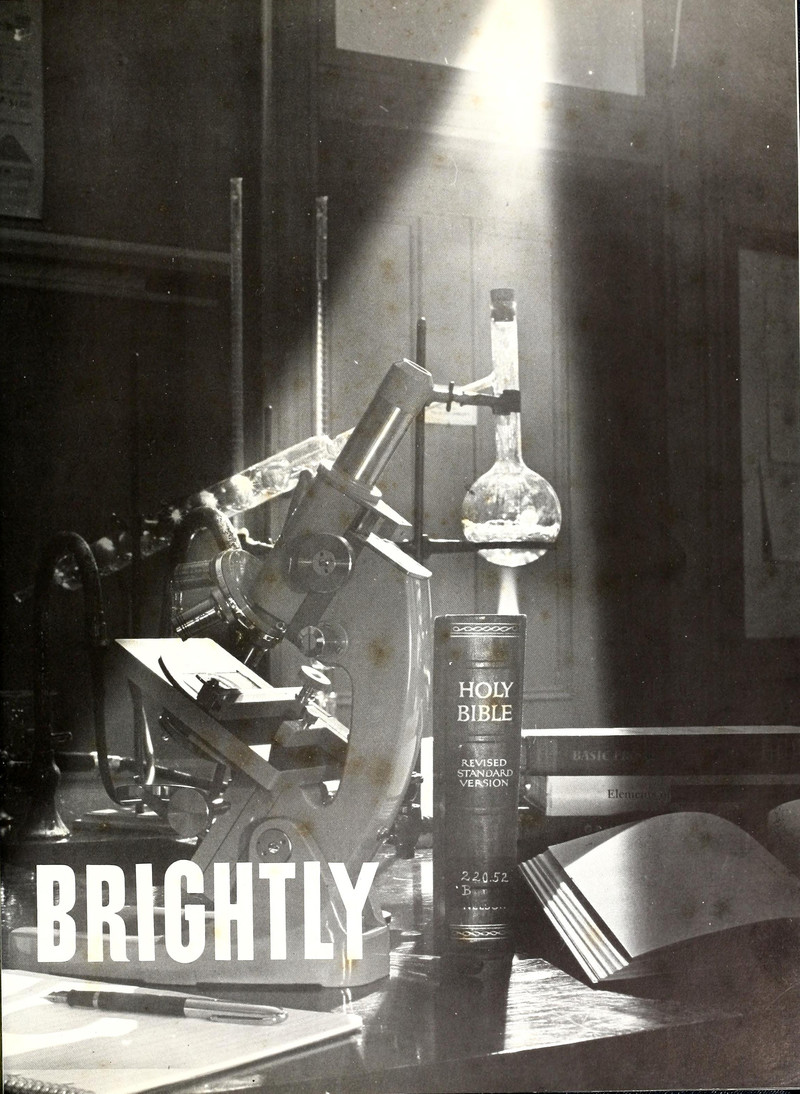 Surprisingly, this page from a religious college's yearbook revises the Bible, changing "through a glass, darkly" (1 Corinthians 13) to "brightly," a revision used by anti-religionists. (There's even a book with this revision as its title: Through a Glass Brightly: Using Science to See Our Species as We Really Are.) Unable to control themselves, the yearbook editors ran with the revisionism and brought coffee into it: "Through a glass warmly." From Mount Olive's 1963 yearbook.