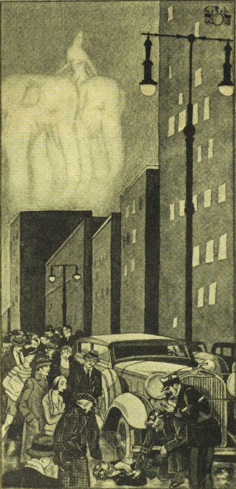 An illustration from a 1910 issue of Scribner's magazine. The caption reads: "There was a whir of wheels in the air, a lurch into space."