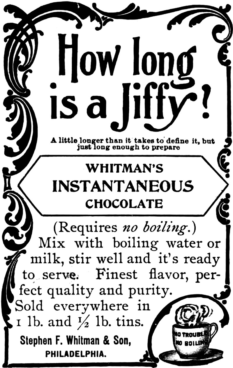 How long is a jiffy? "A little longer than it takes to define it, but just long enough to prepare [instant cocoa]." This ad lies just as all ads do -- it says that the hot cocoa requires "no boiling," yet the chocolate is added to boiling water. So there's no boiling, except for the boiling. It's despicable, but such is the world of advertising. From Judge's Library, 1896.
