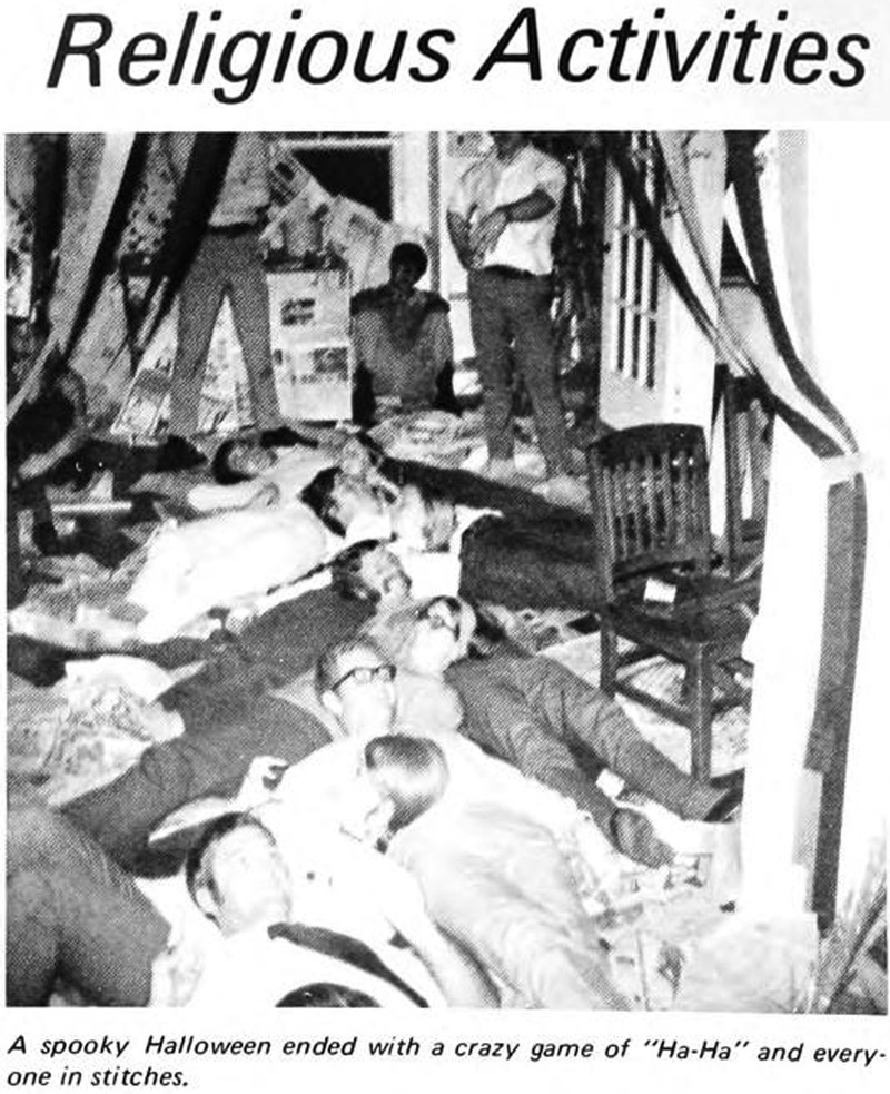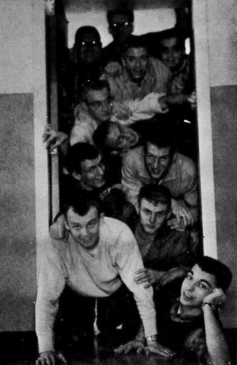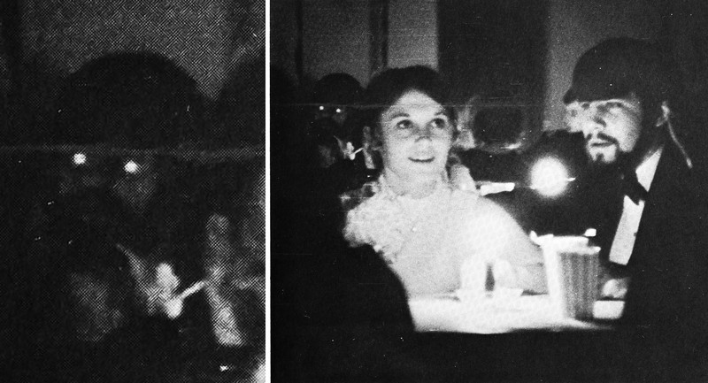 Note the glowing-eyed entities looming in the very back. So often what begins as innocent fun takes a demonic turn. This cursed image is from MacMurray's 1961 yearbook.