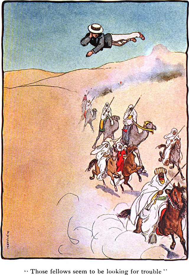 An illustration from The Master Key by L. Frank Baum (1901).  The caption reads: "Those fellows seem to be looking for trouble."