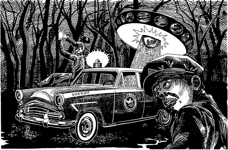 "I meet the flying saucer man!"  From Mystic Magazine, 1954.