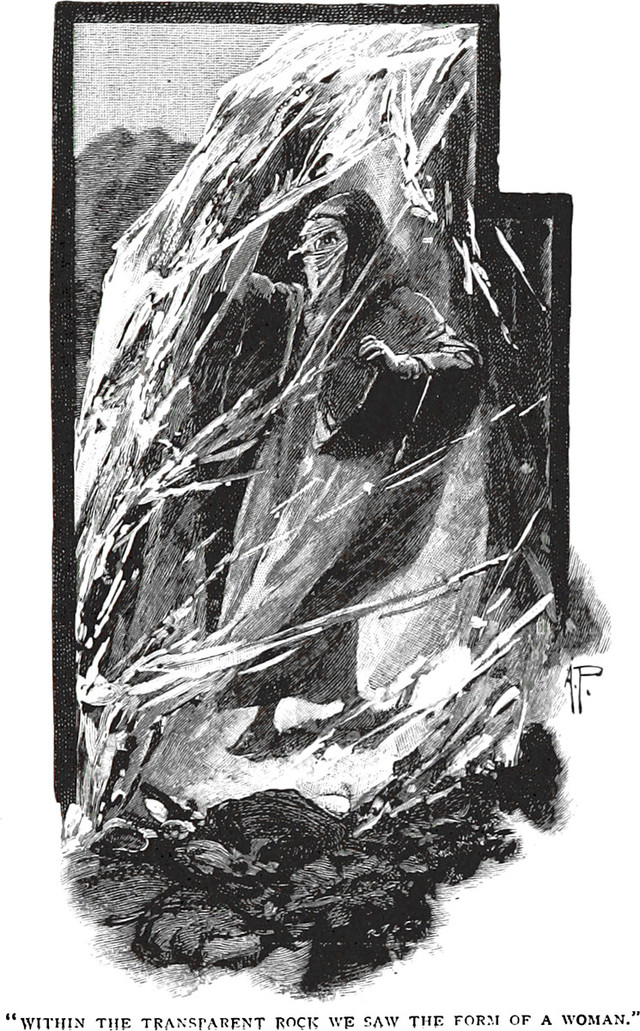 An illustration from Shafts from an Eastern Quiver by Charles Jodrell Mansford (1894). The caption reads: "Within the transparent rock we saw the form of a woman."