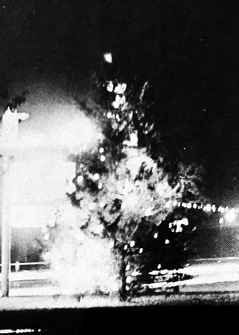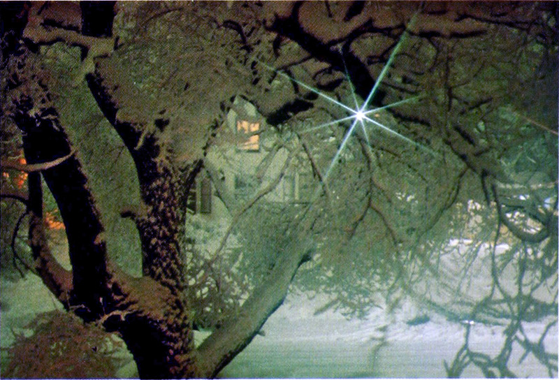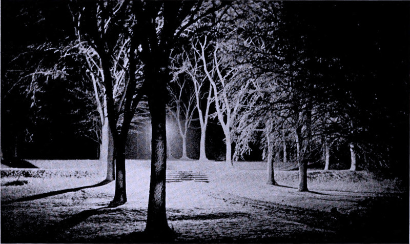 Mysteriously glowing trees spread in a forest of their own, seen only through the windows of vintage college yearbooks. From Indiana University's 1974 yearbook.