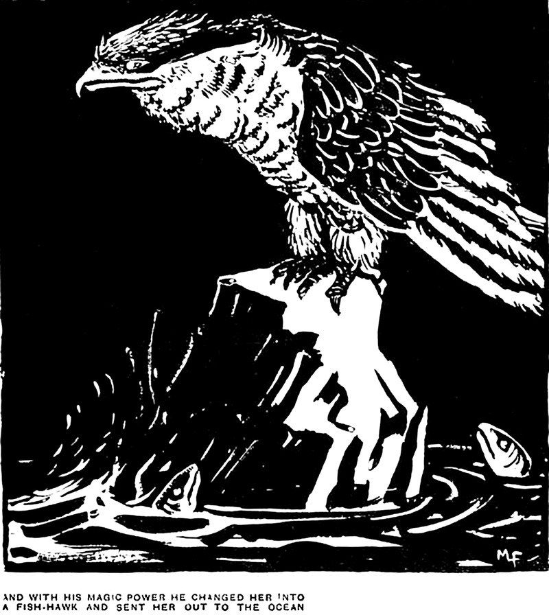 "And with his magic power he changed her into a fish-hawk and sent her out to the ocean."  From Canadian Fairy Tales by Cyrus MacMillan, 1922.
