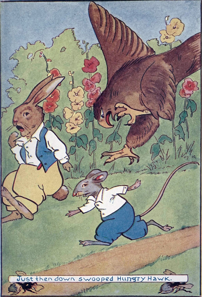#vintage illustration #anthropomorphism #animal attack #rabbit #mouse #hawk