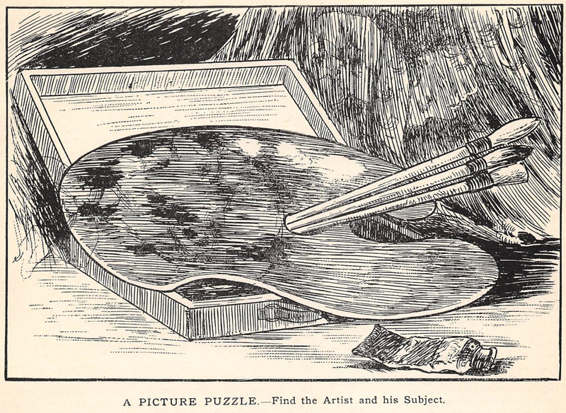 Answers: Rotate the image counter-clockwise and look for bearded King Neptune and his trident in the space between the tree and the hillside. The smaller mermaid's face is in the water touching the shoreline, below left of the shell.