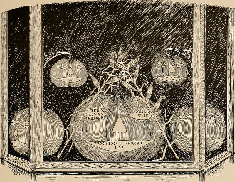 Just as the goddess Diana showed that the hunter and the stag are one, this vintage window display shows that the pumpkin and the knife are one in the jack-o'-lantern. From One Hundred Easy Window Trims, 1913.