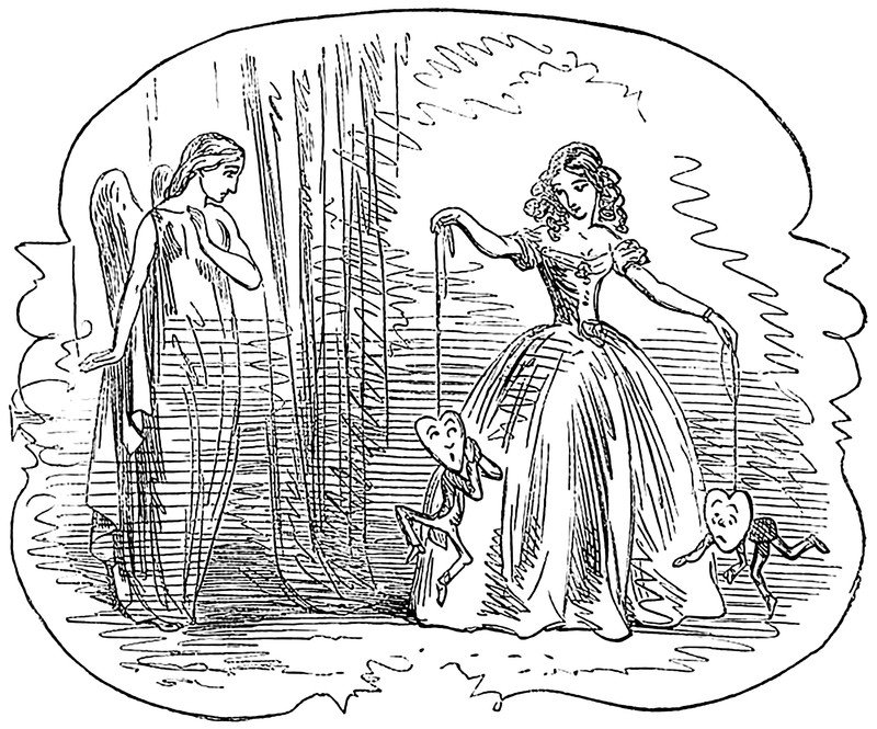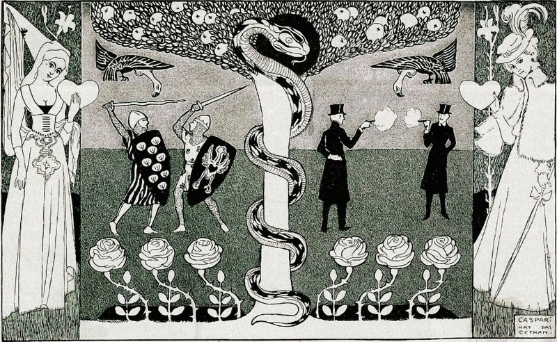 "Love and Death," with Death having collapsed and blind Love stepping forward. From Fliegende Blätter, 1925.