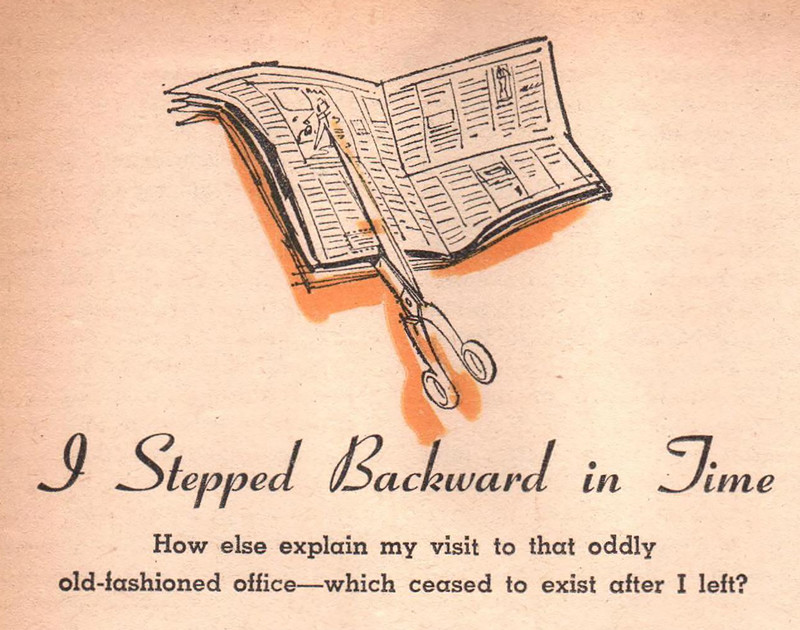 "I stepped backward in time. How else explain my visit to that oddly old-fashioned office—which ceased to exist after I left?" From Fate magazine, 1960.