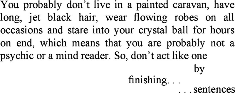 Here's a frightful example of a text not reading its reader's mind. It even predicts that you don't live in a painted caravan and stare into a crystal ball for hours ( we do!) and that you aren't a mind reader ( we are!). It's a classic case of "what you say about others is what you mean about yourself." From Baked Beans & Somtam by Rick Kirtland, 2016.