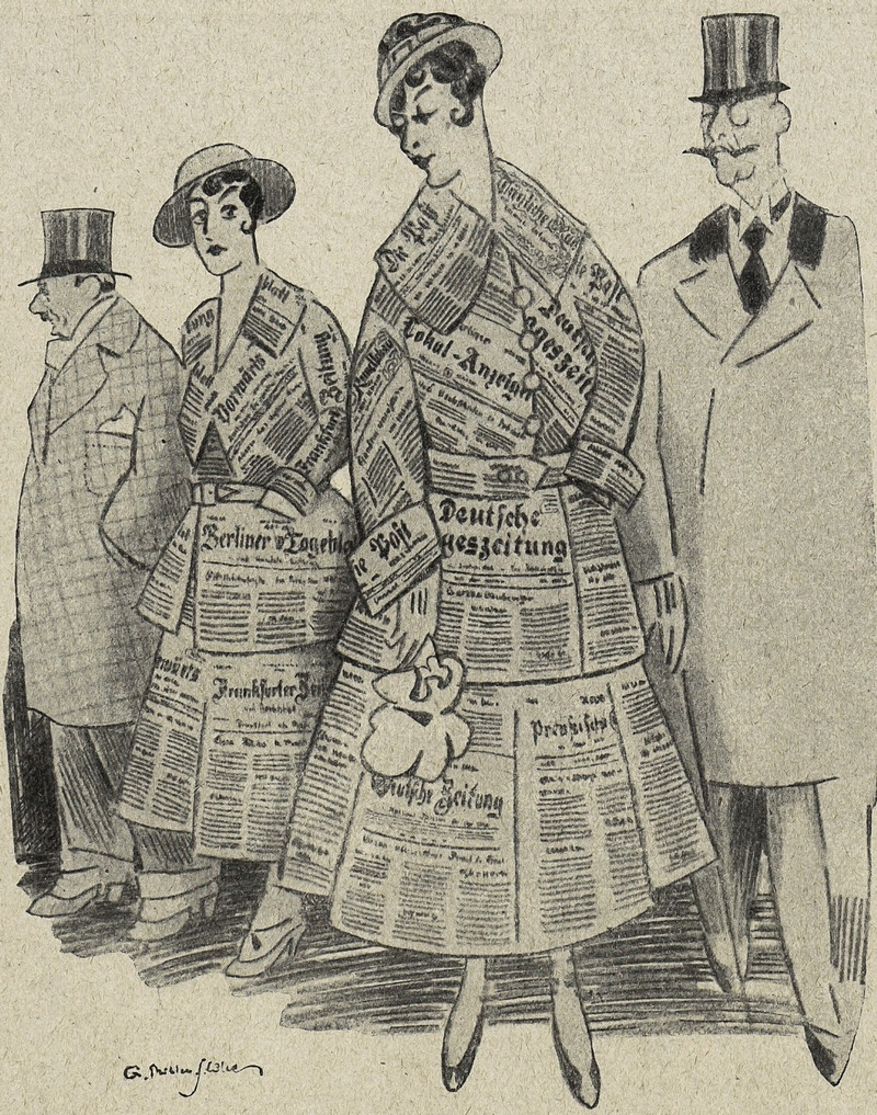 One of these ladies is wearing an imposter designer label. (Insert your own "fake news" joke. Having earned a degree in journalism, we bemoan the current degradation of the media. Granted, the press has never in history truly been free; it has always been a propaganda engine, but traditionally there was at least a pretense of objectivity. As La Rochefoucauld famously said, "hypocrisy is a tribute vice pays to virtue." Now it's bare-faced bias. Disgusting!) From Lustige Blätter, 1917.