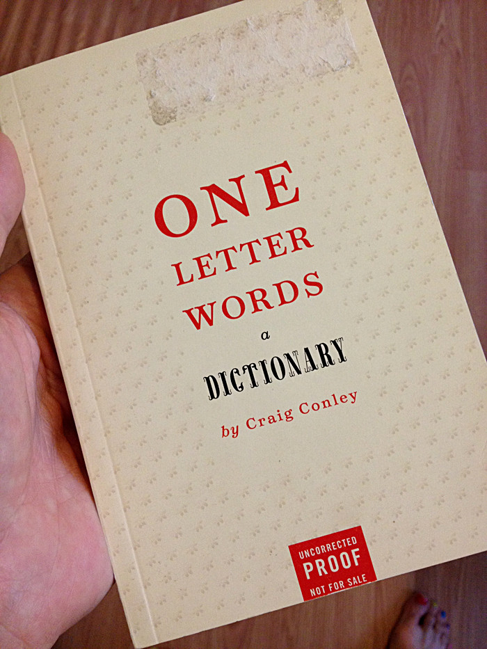 Geof Huth told us that he just acquired an uncorrected proof of One-Letter Words: A Dictionary, the first in a collection of uncorrected dictionary proofs. We're now hoping that O.L.W.'s proof is riddled with errors and constitutes a wicked reference like The Wicked Bible of 1631 (though that one, if memory serves, is merely missing a "not" in one of the Commandments). We love the idea of uncorrected proofs deliberately being cited as [faulty] evidence. We didn't think to tell Geof this, but we're picturing an entire research project in which every single footnote references an uncorrected proof. No one has any reason to know this, but when we appeared at O.L.W. book signings/talks, we read favorite one-letter words from the uncorrected proof. Our talks were technically illegitimate, springing from liminal matter that wasn't quite the "thing" itself. We didn't do it as some sort of art piece (more fool we) but were merely caught between worlds: a reclusive writer publicly reading from a softcover of a hardcover to people listening but not buying any of it.