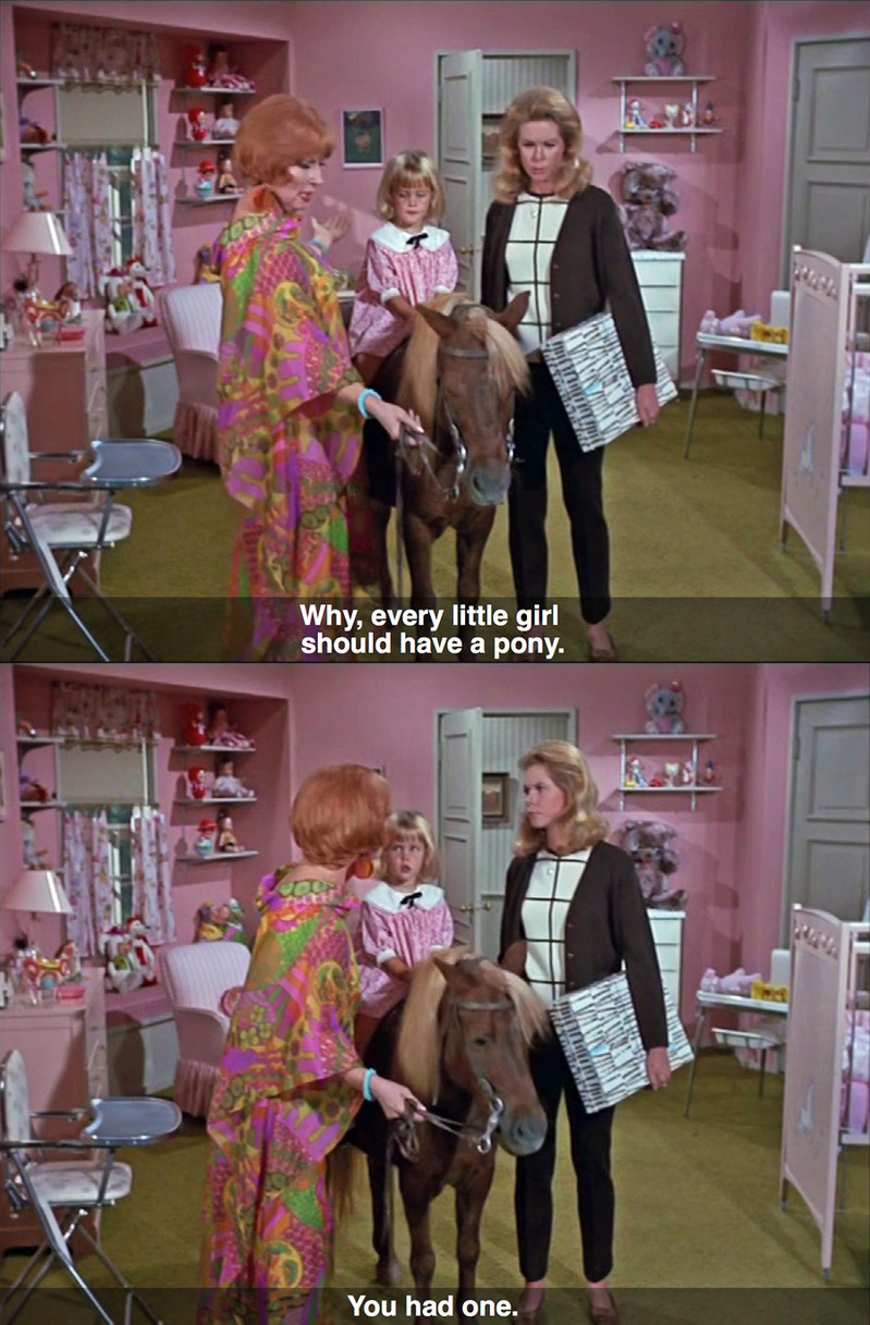 The classic Bewitched episode "Solid Gold Mother-in-Law" offers a precursor to the Seinfeld episode "The Pony Remark."