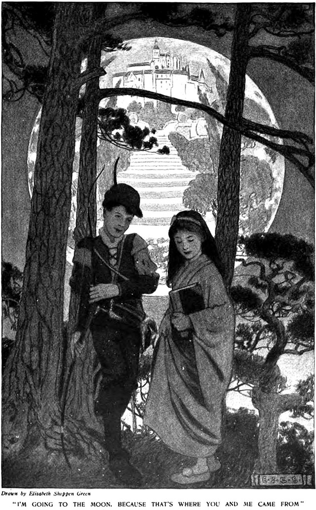 "Sailing by the moon." From The King of Gee-Whiz by Emerson Hough and illustrated by Oscar E. Cesare, 1906.