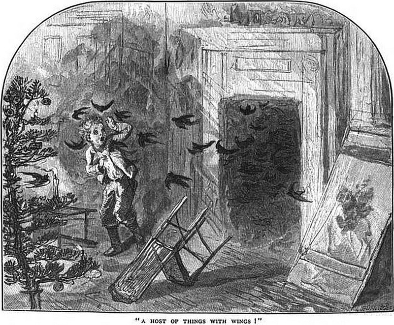 At first we thought this was a rain of pollen. Fellow allergy-sufferers will delight in knowing that it's just some fly swatting. From Beggars on Horseback: A Riding Tour of North Wales by Martin Ross, illustrated by E. Somerville, 1895.